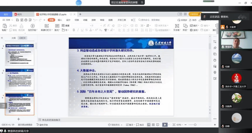 曹景林教授在报告中着重阐释了数理统计与经济统计的历史发展联系与区别。他强调学科建设与科研工作需要基于中国国情,研究中国经济社会发展的重要问题、讲好中国故事、展现中国式现代化的伟大成就。他指出,当前科研工作要立足于国情国势,充分利用大数据和互联网技术优势,在传统统计方法和经济理论范式的基础上融入数据科学等新元素,在应用上与经济金融、产业工程等深入融合,齐心协力,不断创新,搭建“新经济统计”应有的新的理论、方法、标准和应用领域。
