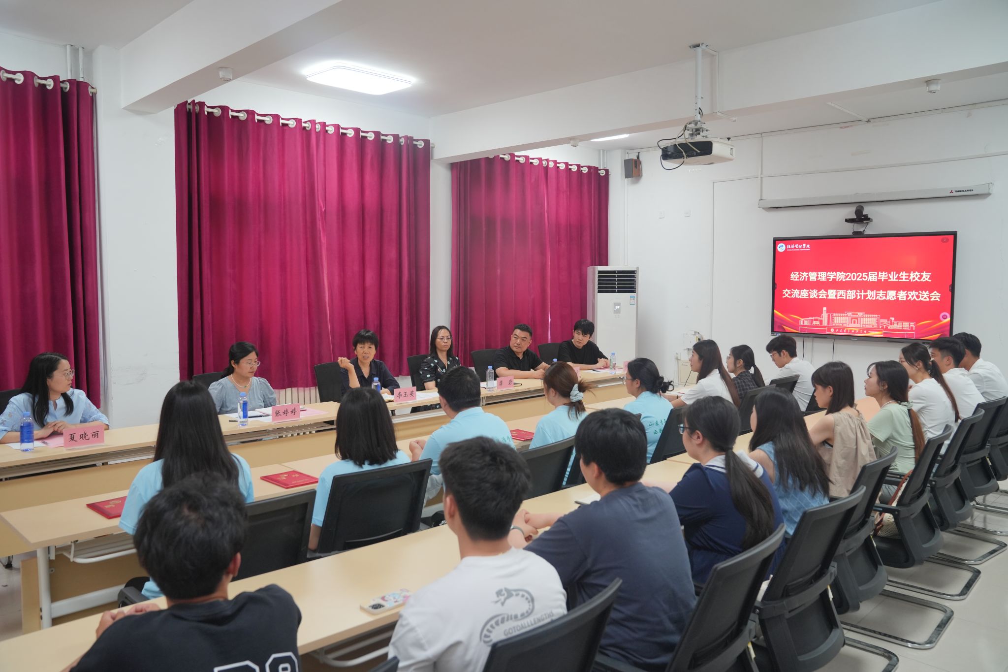 学院特别策划制作了以“青春绽放·未来可期”为主题的毕业祝福视频,以镜头为笔、以情感为墨,勾勒属于山青经管人的独家记忆。视频中,学院领导、班主任、辅导员及在校生代表通过镜头,向毕业生们送上最真挚的祝福,毕业生们也回忆了大学最难忘的时光,并发出“从经管出发,到祖国最需要的地方去”的青春誓言。敏行楼前,精心设计的2025届毕业生纪念展板上镌刻着每一位毕业生的名字;“青春不散场,扬帆再起航”的寄语,饱含了对大学时光的珍视,又寄托了对美好未来的期盼。学院组织各专业班级召开毕业主题班会,辅导员、班主任老师与同学们共话难忘大学时光,那些共同的青春印记,让离别的愁绪化作“此去经年,顶峰相见”的期许。