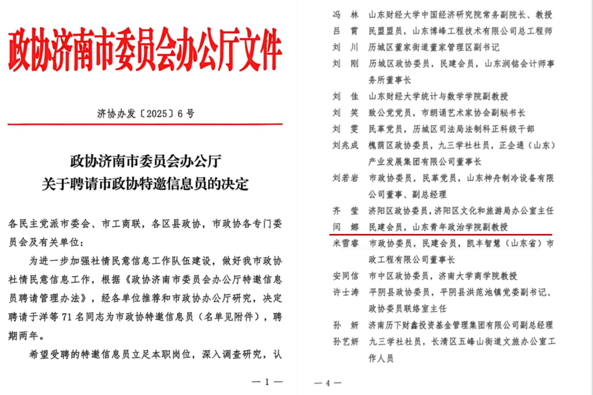 近日,政协济南市委员会办公厅印发《关于聘请市政协特邀信息员的决定》,我校民建会员、yl6809永利检测中心副教授闫娜获聘“济南市政协特邀信息员”。