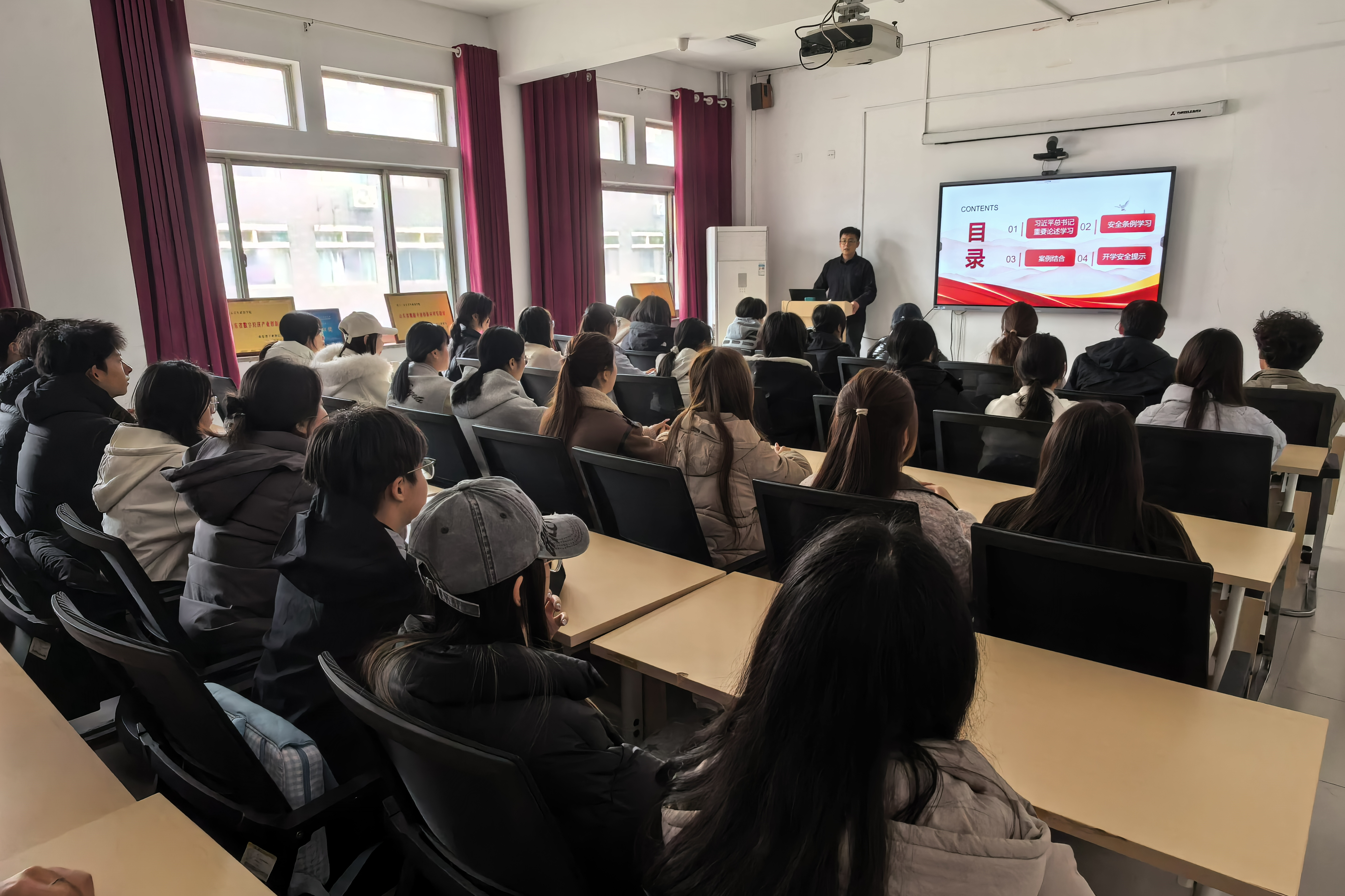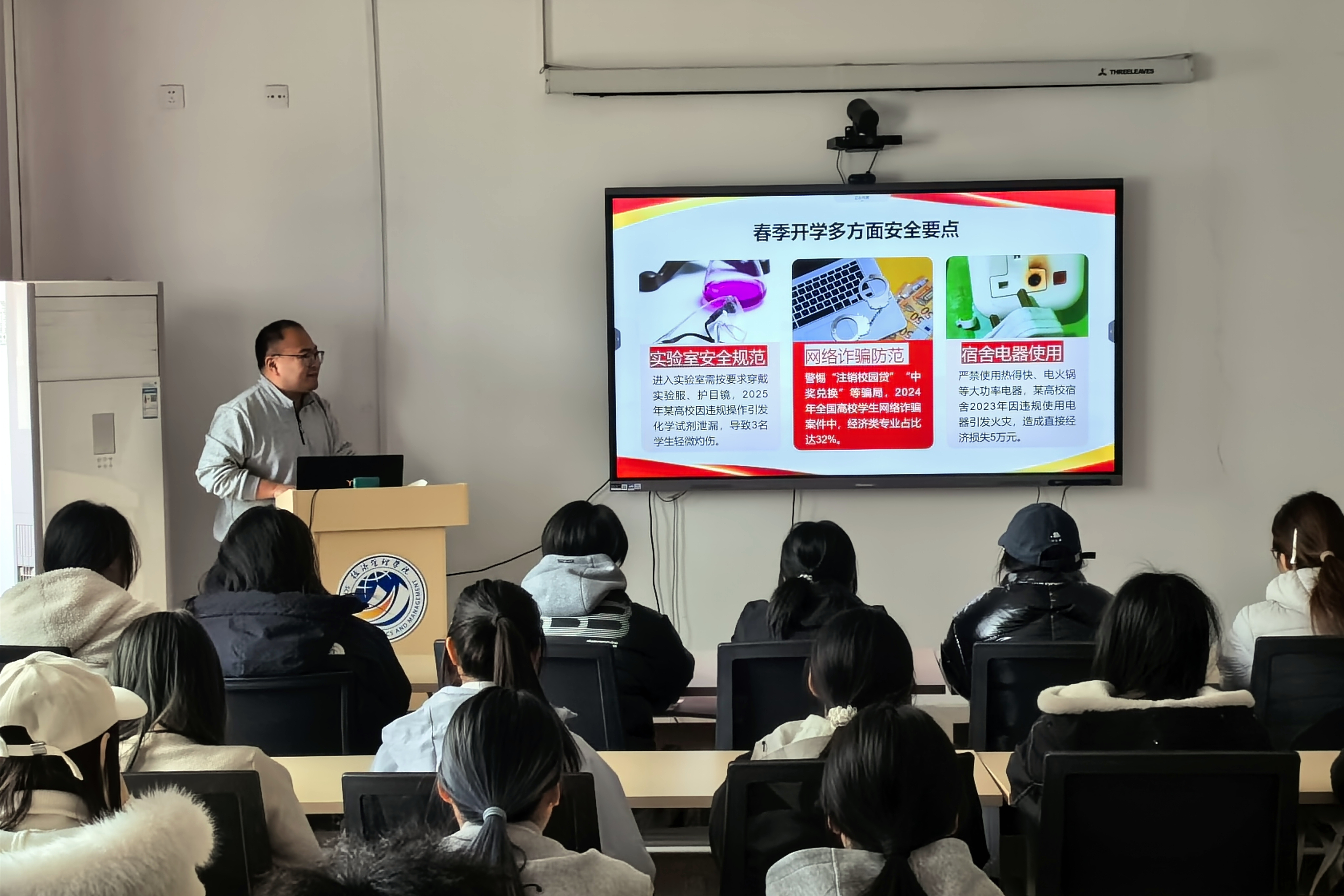 围绕学生安全教育工作,由全体辅导员牵头,以主题班会为主要载体,结合专题宣讲、案例剖析、线上学习等多种形式,组织学生系统学习校园安全管理规章制度,围绕校园欺凌、校车安全、电信网络诈骗等典型案例开展以案释法,重点推进消防安全、交通安全、食品安全、反诈防骗、心理健康等专题教育,帮助学生掌握必要的安全防护知识和应急处置技能,切实提升自我防范意识和能力。