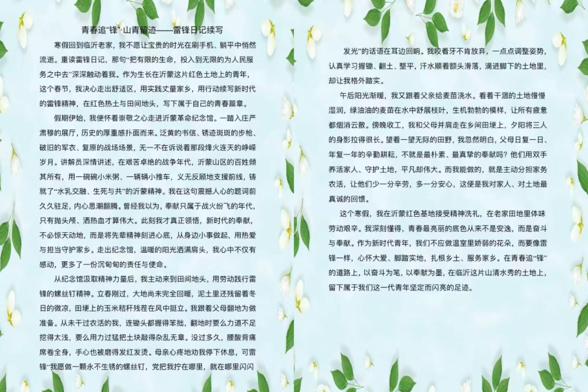 文化浸润育人,多元创作传薪火。为让雷锋精神可感可触、入脑入心,学院推出系列主题文化创作活动。“追‘锋’筑梦 墨韵扬情”征文比赛、“书韵传锋 笔墨初心”书法实践、“追‘锋’润心 笔墨传情”绘画活动,以及“青春追‘锋’ 山青留迹”雷锋日记续写征集活动同步开展。同学们以文字抒怀、以笔墨传情、以画笔定格,用散文、诗歌、书法、绘画、日记等形式,书写榜样事迹、记录志愿瞬间,将雷锋精神与传统文化、青春感悟深度融合,让榜样力量在文艺创作中薪火相传。