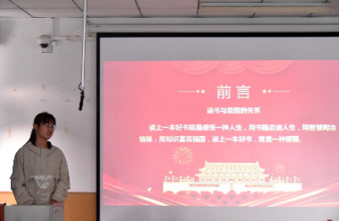 活动中,张冰从自身经历切入,围绕“为何读书”、“读什么书”、“怎样读书”、“怎样用书”等问题与同学们进行了交流讨论,倡导大家努力读书,树立远大理想,为国家做出应有的贡献;同时引导同学们要正确看待历史和当下,不可盲目自信,找准差距方能努力前行。三位读书分享人以文化自信为主题,由中国作为一个延绵数千年古老文明国家的独特性展开,结合自身的思考和实践向大家分享了读书心得,积极倡导大家阅读经典,探寻“文明型国家”的深刻内涵及意义,抒发了同祖国之间的深厚情感,激励大家为讲好“中国故事”,实现强国之梦做出努力。活动现场气氛热烈,掌声雷动。